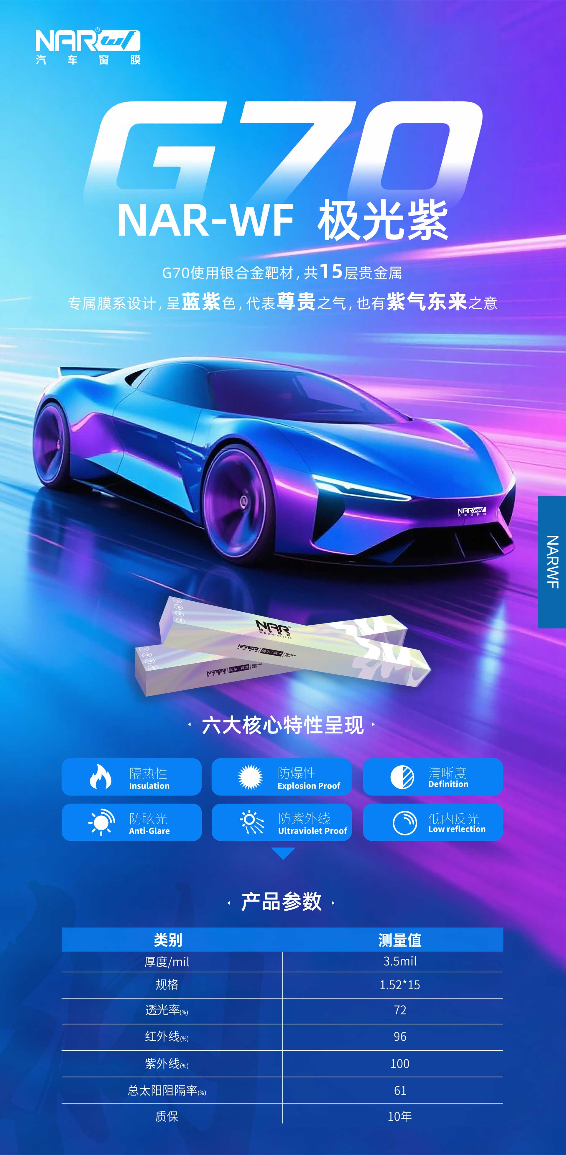 G70使用银合金靶材,共15层贵金属专属膜系设计,呈蓝紫色