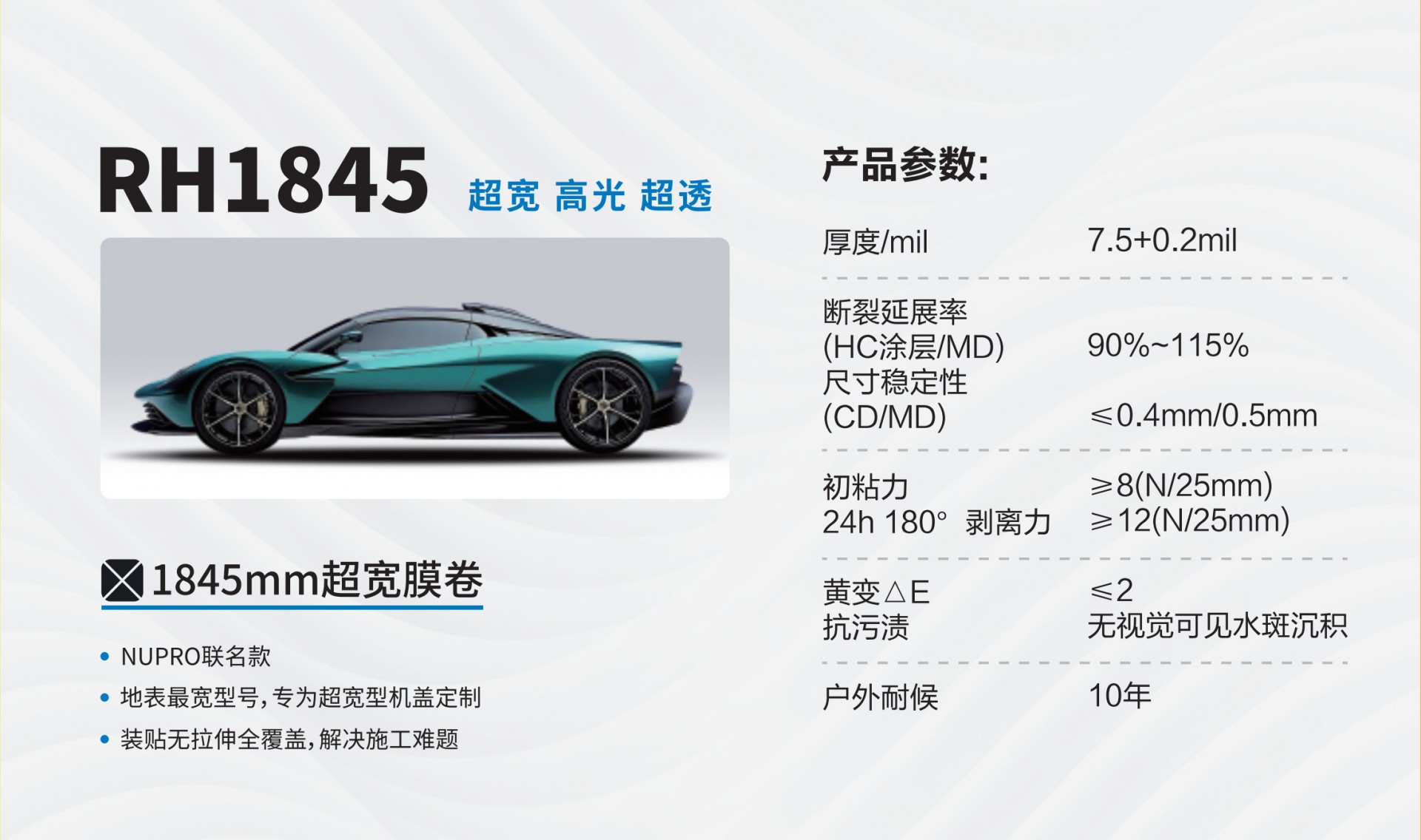 1845mm超宽膜卷NUPRO联名款地表最宽型号,专为超宽型机盖定制装贴无拉伸全覆盖,解决施工难题